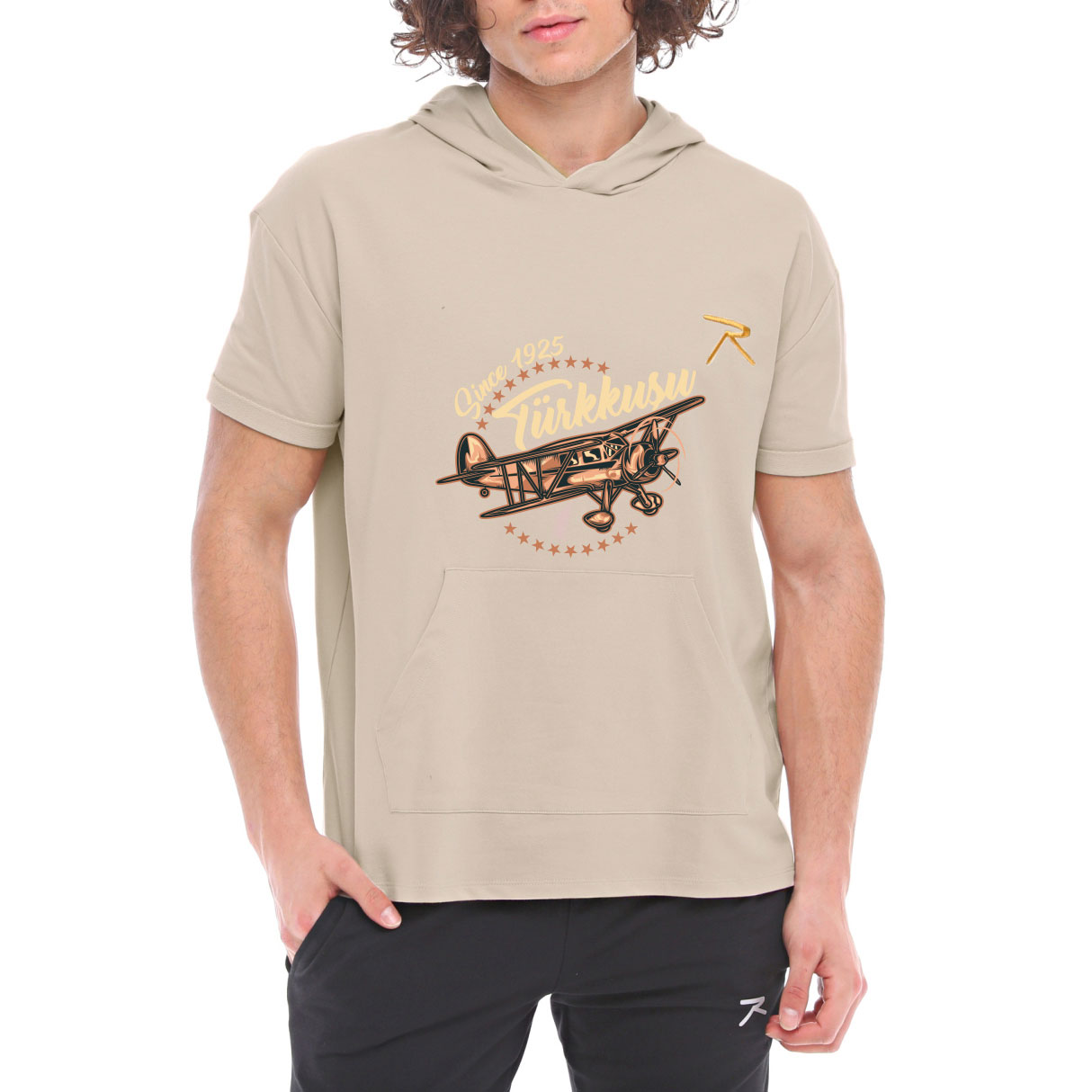 %95 Cotton %5 Likra Raru Short-Sleeve Hooded Sweatshirt Homewear / Lounge Clothing, 2-thread fabric, Relaxed fit, Hooded, Kangaroo pocket, Casual / Basic, Comfortable, White Raru ''R'' embroidered logo on the left chest of the men's short-sleeve hooded sweatshirt. Model's measurements: Chest: 103cm Waist: 77cm Hips: 101cm Height: 190cm Weight: 80kg Product size on the model: Large