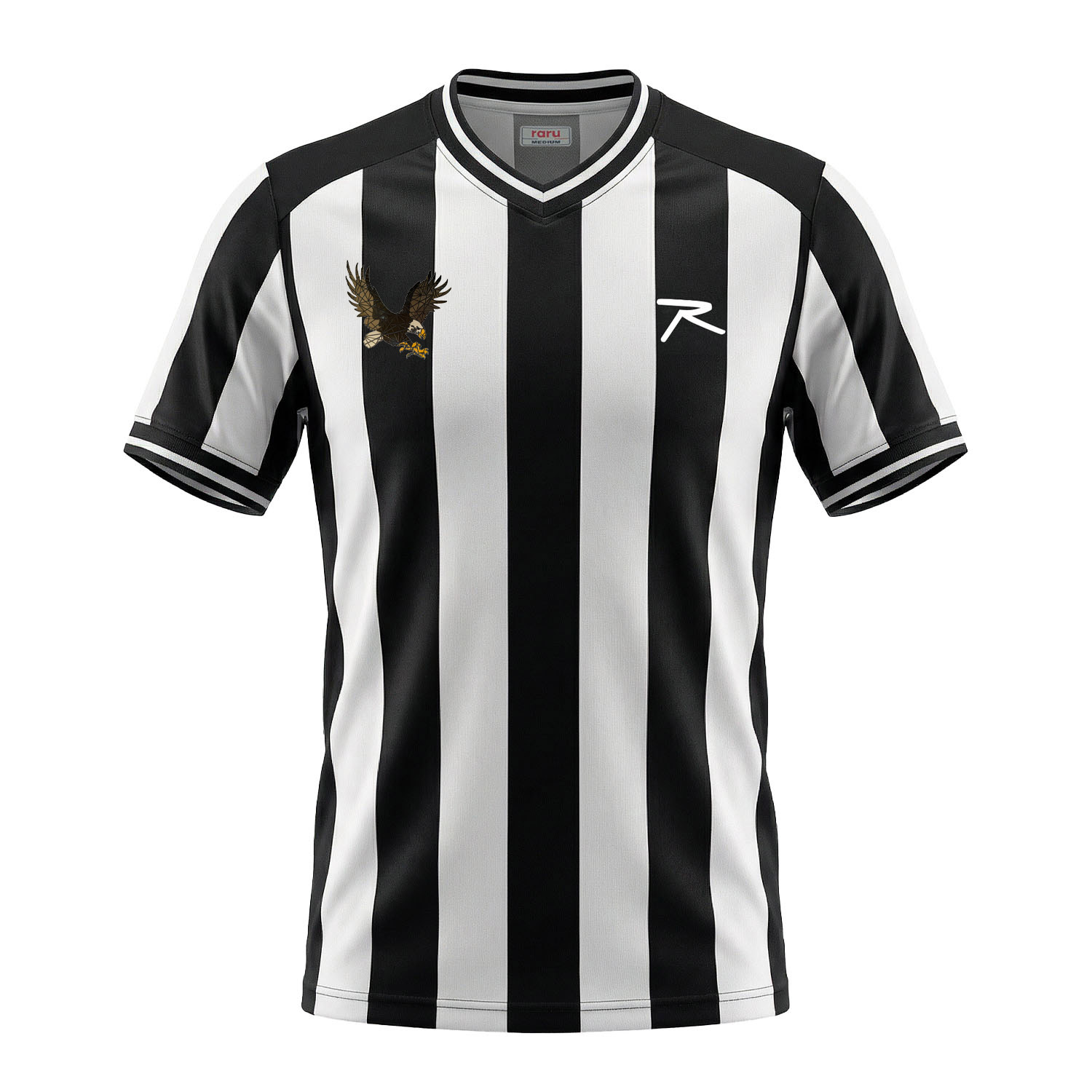 %100 Polyester Raru Forma T-Shirt AQUILA. Regular kalıp, V yaka, Yaka ve kol ucu ribanalı, Dijital desen baskılı ön yüzey,Sol göğüste Raru R logo, sağ göğüste kartal arma baskılı tişört.